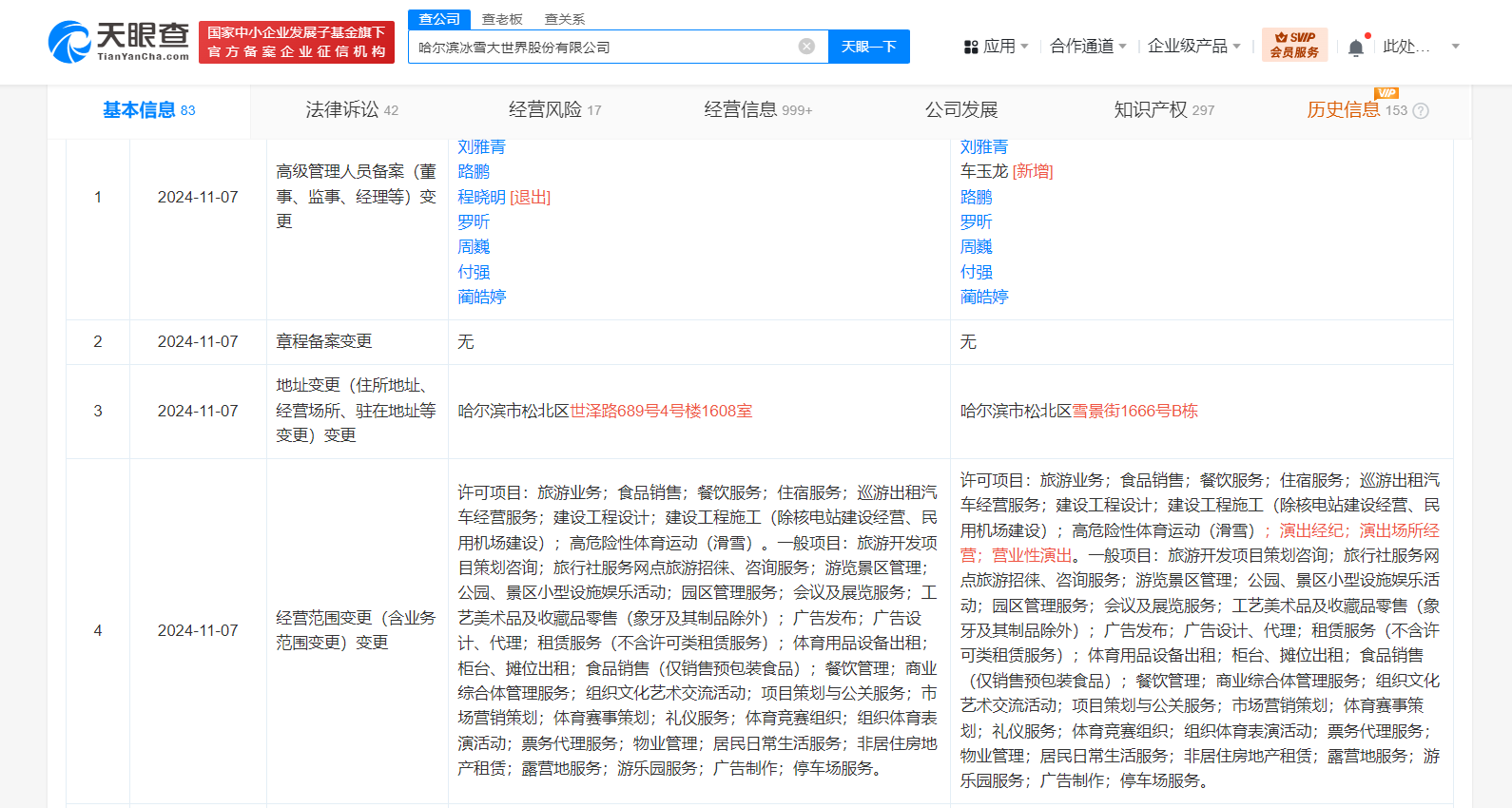 天眼查App显示,近日,哈尔滨冰雪大世界股份有限公司发生工商变更,经营范围新增演出经纪、演出场所经营、营业性演出业务,同时,部分主要人员也发生变更。