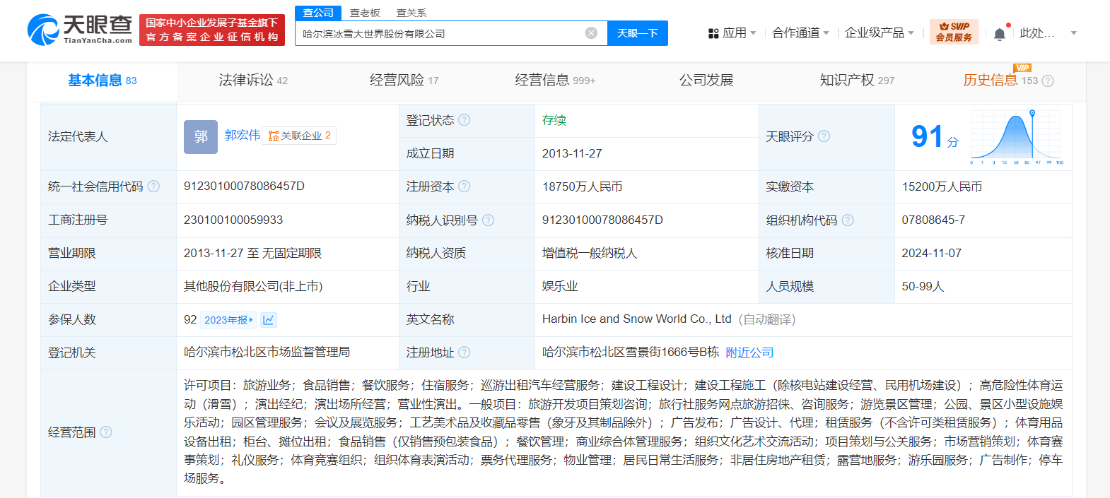哈尔滨冰雪大世界新增营业性演出业务 哈尔滨冰雪大世界新增演出经纪业务观点