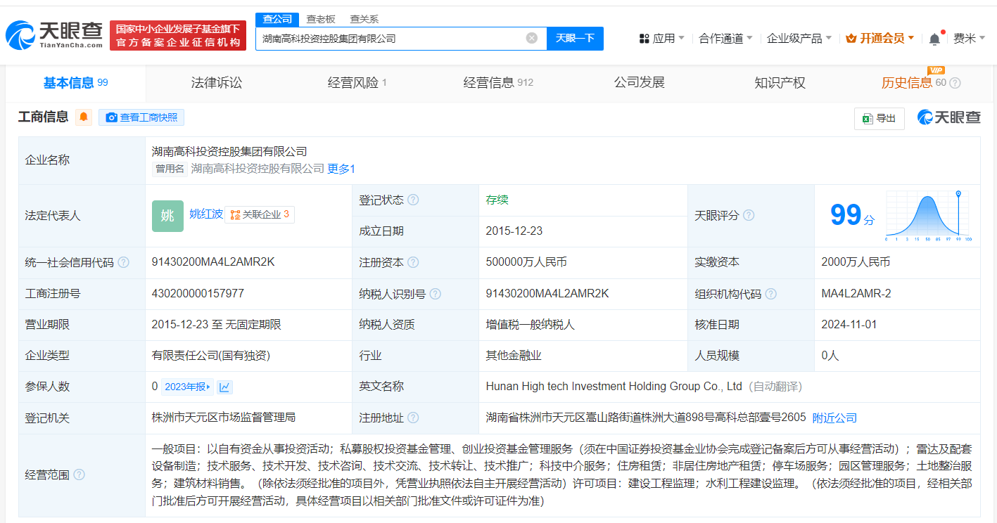 湖南高科投资控股集团有限公司成立于2015年12月,法定代表人为姚红波,经营范围含以自有资金从事投资活动、雷达及配套设备制造、科技中介服务、住房租赁、非居住房地产租赁、停车场服务等,由株洲高新技术产业开发区管理委员会全资持股。