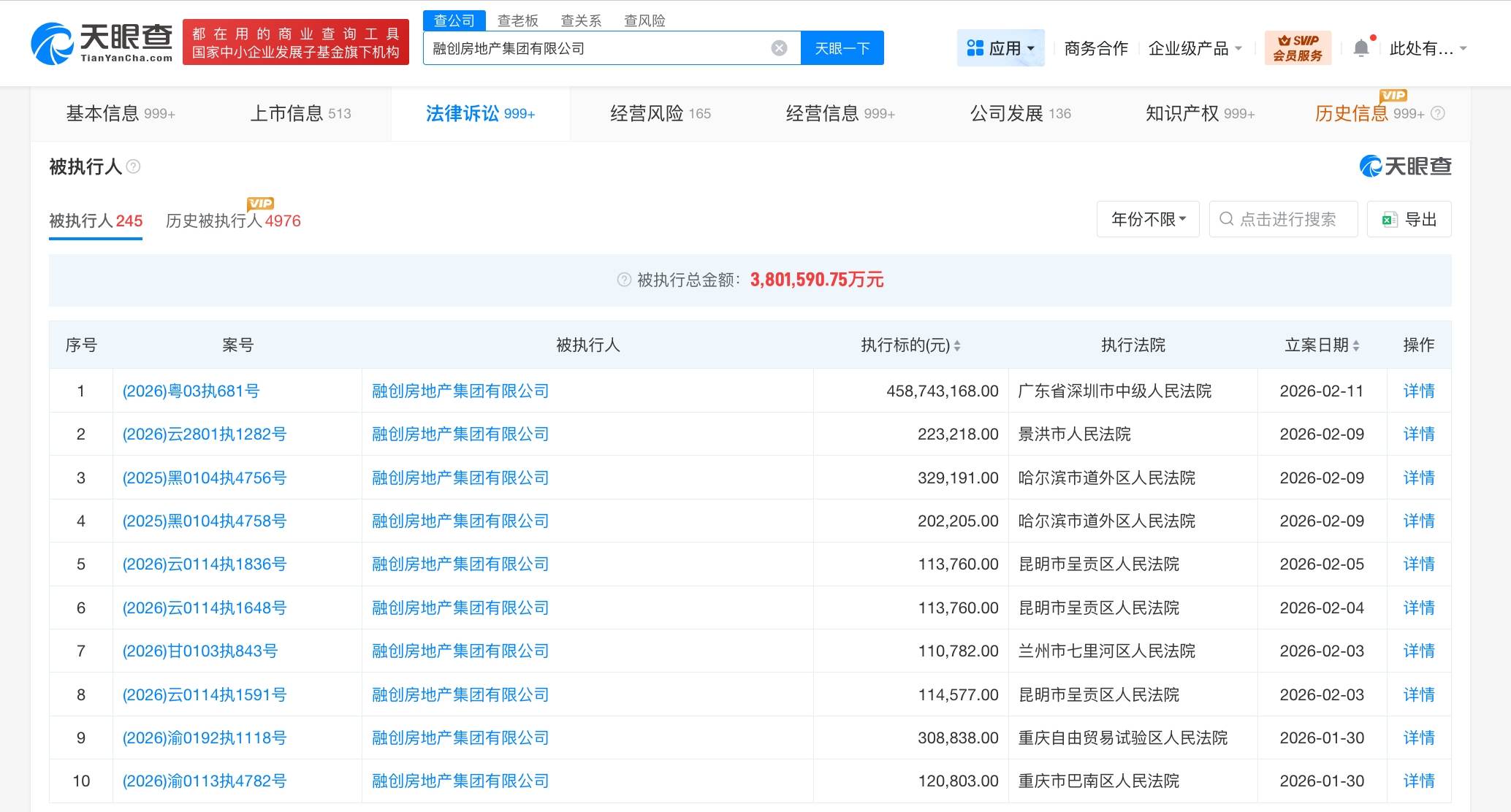 天眼查天眼风险信息显示,2月11日,融创房地产集团有限公司、珠海市昌荣房地产开发有限公司新增一则被执行人信息,执行标的4.5亿余元,执行法院为广东省深圳市中级人民法院。