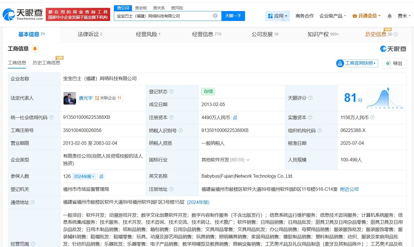 宝宝巴士(福建)网络科技有限公司成立于2013年2月,法定代表人为唐光宇,注册资本4490万人民币,经营范围包括动漫游戏开发、数字文化创意软件开发、数字内容制作服务等。股东信息显示,该公司由宝宝巴士股份有限公司全资持股。