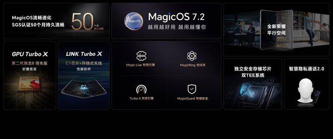 秉承荣耀“双轮驱动”的理念,经过2年的发展,Magic系列在屏幕、续航、通讯、拍照、安全、智慧化等关键核心能力上,已经有了深厚的技术积累,并且实现了底层技术突破。在第三年,荣耀的零风险调光护眼屏幕技术全球领先,C1自研射频增强芯片带来的5G通信能力成为业界标杆,青海湖电池打破旗舰机的续航天花板,MagicOS的平台级AI能力、双TEE安全系统等都领先业界。可以说,在诸多底层技术方面,荣耀都已经构筑了与苹果竞争的实力。
