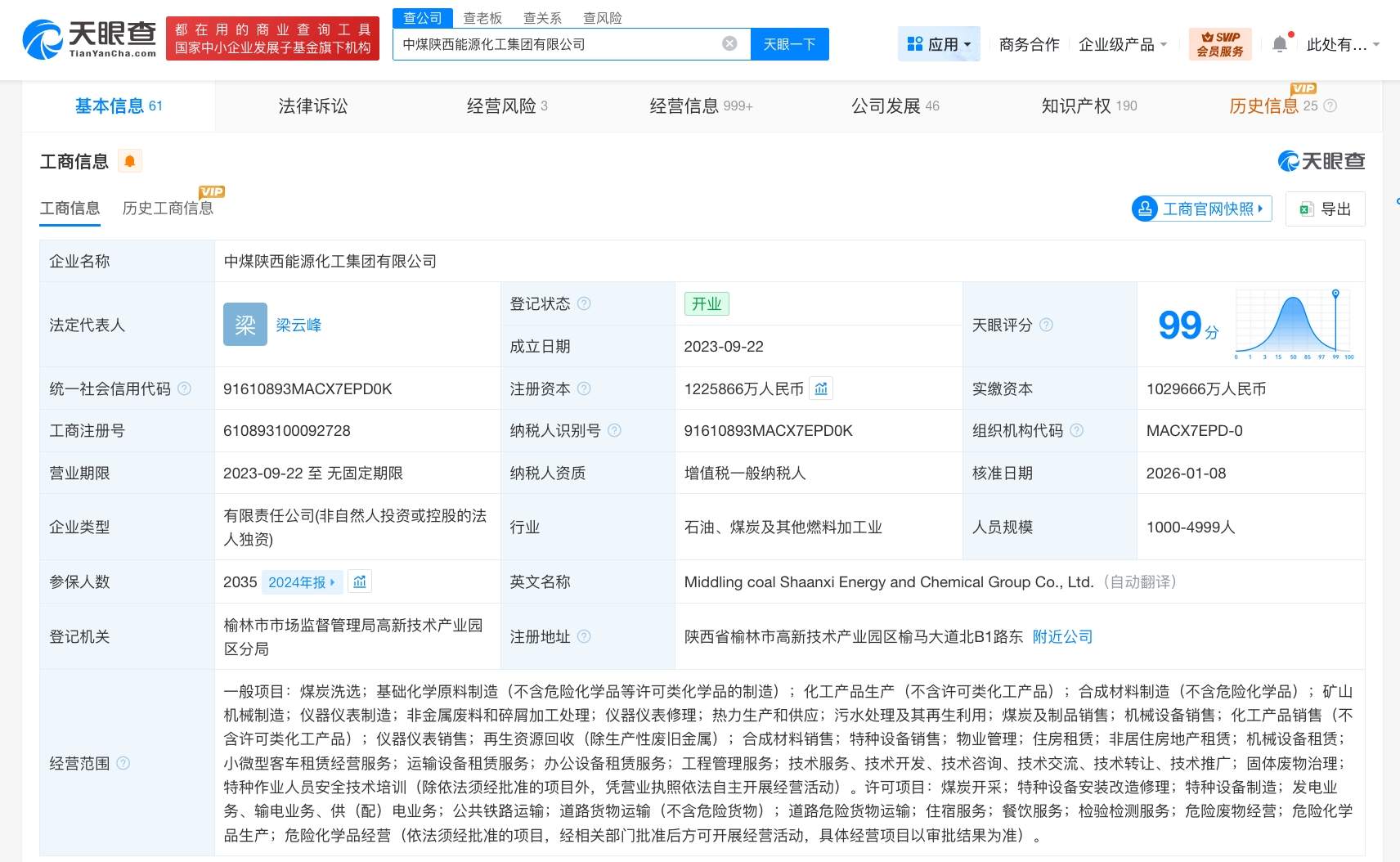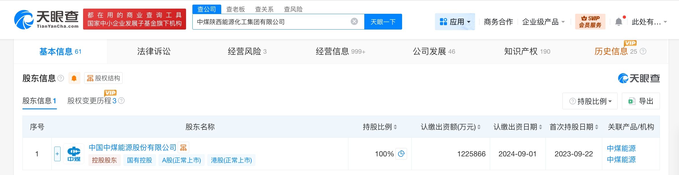 天眼查工商信息显示,近日,中煤陕西能源化工集团有限公司发生工商变更,注册资本由约103亿人民币增至约122.6亿人民币,增幅约19%。