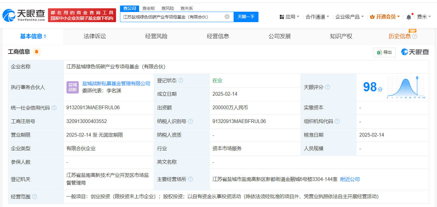 天眼查App显示,近日,江苏盐城绿色低碳产业专项母基金(有限合伙)成立,执行事务合伙人为盐城战新私募基金管理有限公司,出资额20亿人民币,经营范围为创业投资、股权投资、以自有资金从事投资活动,由盐城市战略性新兴产业母基金合伙企业(有限合伙)、江苏省战略性新兴产业母基金有限公司、盐城战新私募基金管理有限公司等共同出资。