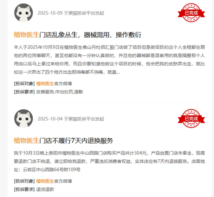截至2025年最后一天,黑猫投诉平台关于“植物医生”的投诉有405条,内容集中于服务差、虚假宣传、同产品价格差距大、器械混用等乱象。问题根源在于,植物医生加盟店在人事、财务、服务标准上高度独立,总部对其约束力有限。