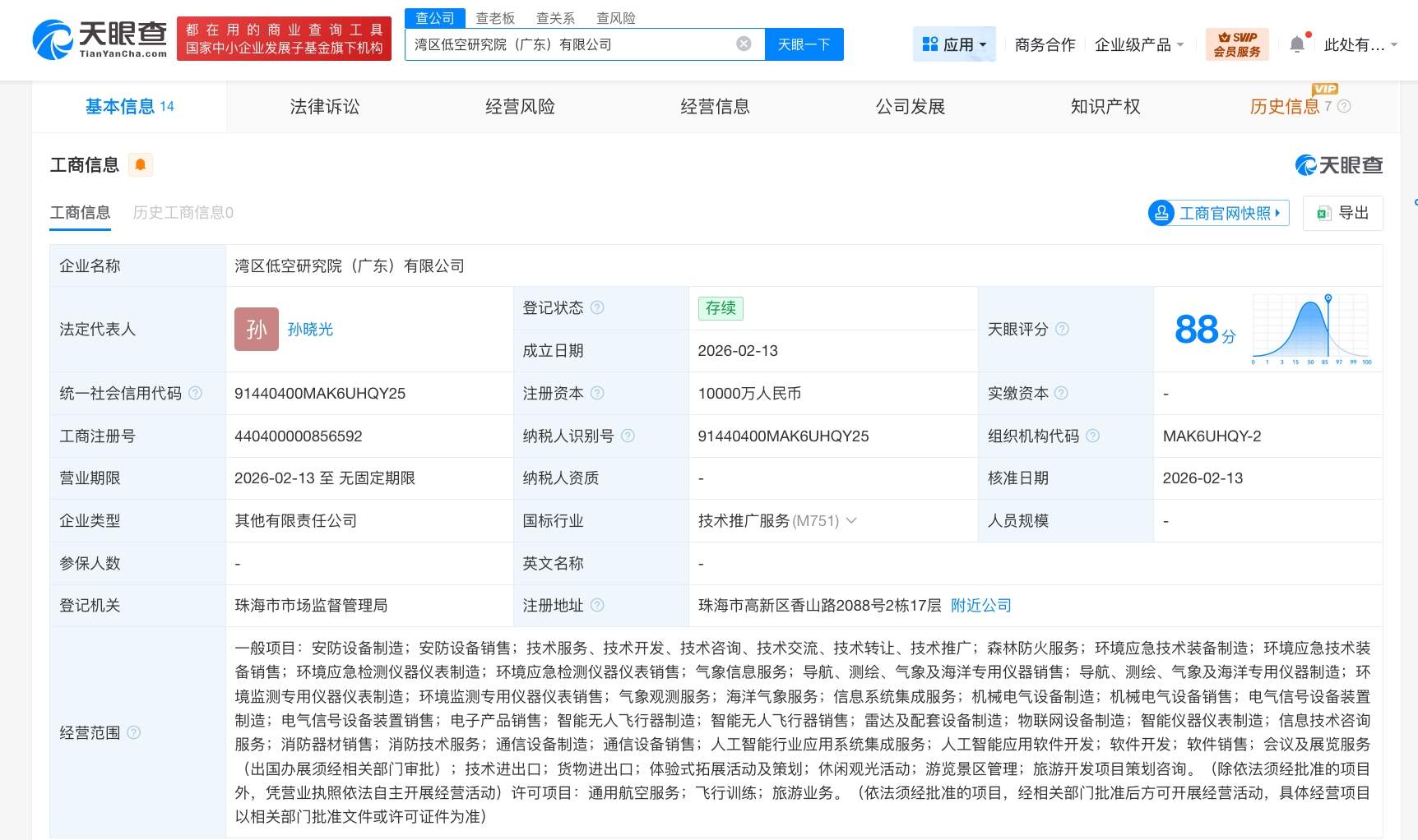 天眼查App显示,近日,湾区低空研究院(广东)有限公司成立,法定代表人为孙晓光,注册资本1亿人民币,经营范围含安防设备制造、气象信息服务、信息系统集成服务、通信设备制造、人工智能行业应用系统集成服务、人工智能应用软件开发、飞行训练、旅游业务等,由中国通号(688009)旗下通号低空智能科技有限公司、珠海理创科信投资合伙企业(有限合伙)、珠海市北理工大湾区创新研究院、珠海市低空产业投资运营有限公司共同持股。
