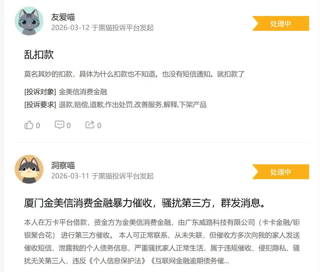 据“黑猫”投诉平台用户反映,金美信消金用户经常遭遇“无故扣费”“乱扣费”等问题。这类“莫名其妙”的扣款,让消费者对持牌金融机构的信任大打折扣。