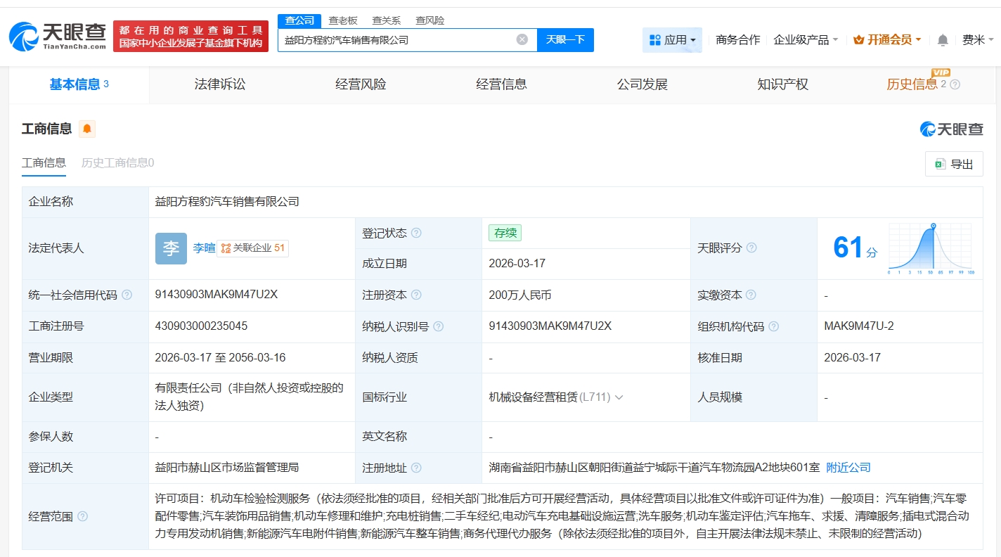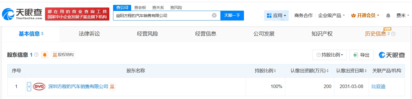 比亚迪方程豹在益阳成立销售公司 注册资本200万观点