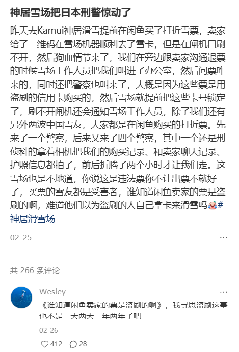 更夸张的是今年2月,有几位中国游客在日本神居滑雪场,他们称提前通过闲鱼购买了所谓打折雪票。