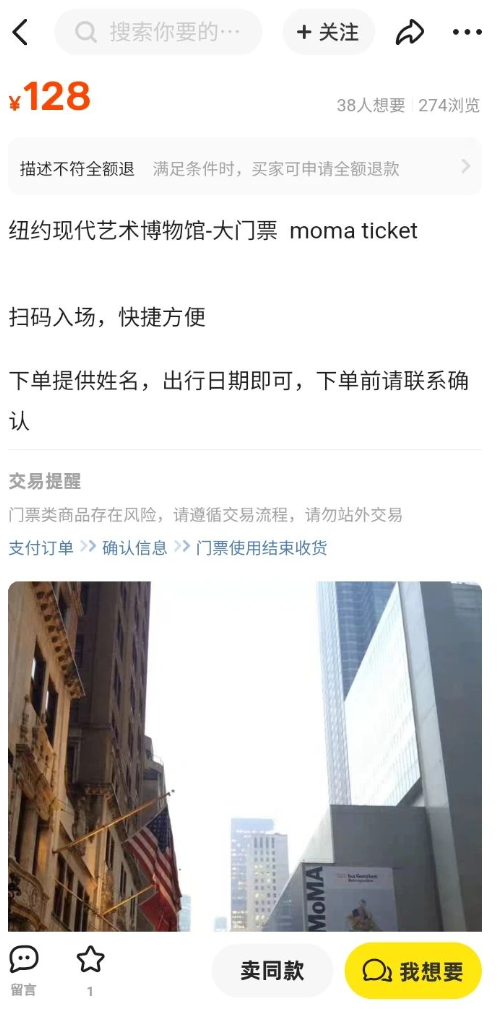 和朋友聊完,我又打开闲鱼,找了个纽约MOMA博物馆的门票卖家随便聊了几句,果然还是熟悉的灰产味道。
