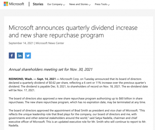 微软还把季度股息提高了6美分,至每股62美分。值得注意的是,该公司已经连续11年在9月中旬宣布大幅提高股息——总是在9月15日至21日之间,涨幅从未低于7.6%,过去三年一直徘徊在10%左右。