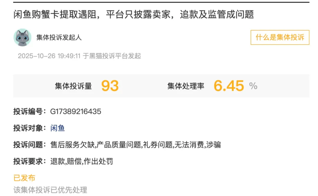 近日,诸多网友在黑猫投诉平台对闲鱼发起了集体投诉,本次投诉因在闲鱼购买的大闸蟹蟹卡所引发的消费争议而起。