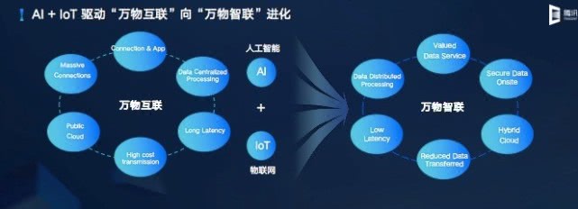 过往我们常说物联网让“万物互联”。万物互联有很多特征:第一个是海量连接;第二个是物联网价值主要来自于连接产生的流量以及物联网应用的价值;第三个是中心化的数据处理,还包括高延迟、高传输费用等等。我们认为物联网发展再进一步的话,应该是从“万物互联”发展到“万物智联”。物联网的价值将更多体现在数据分析和挖掘方面。