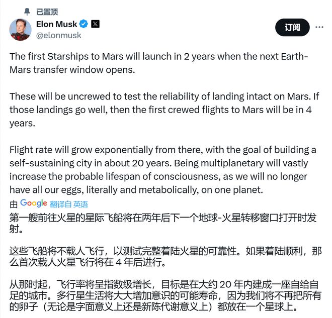 马斯克还补充道:“从那时起,发射频率将呈指数级增长,目标是在大约20年内建成一座自给自足的火星城市。”“实现多星球定居将极大延长人类意识的存续时间。无论从字面意义还是生物学角度,我们都将不再把所有的希望寄托在一个星球上。”