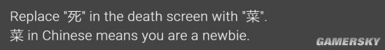 这个Mod将原来的“死”字变成了“菜”,制作者特别提到这是个中文俚语,的确是这样,就是形容新手,菜的抠脚,技术烂。