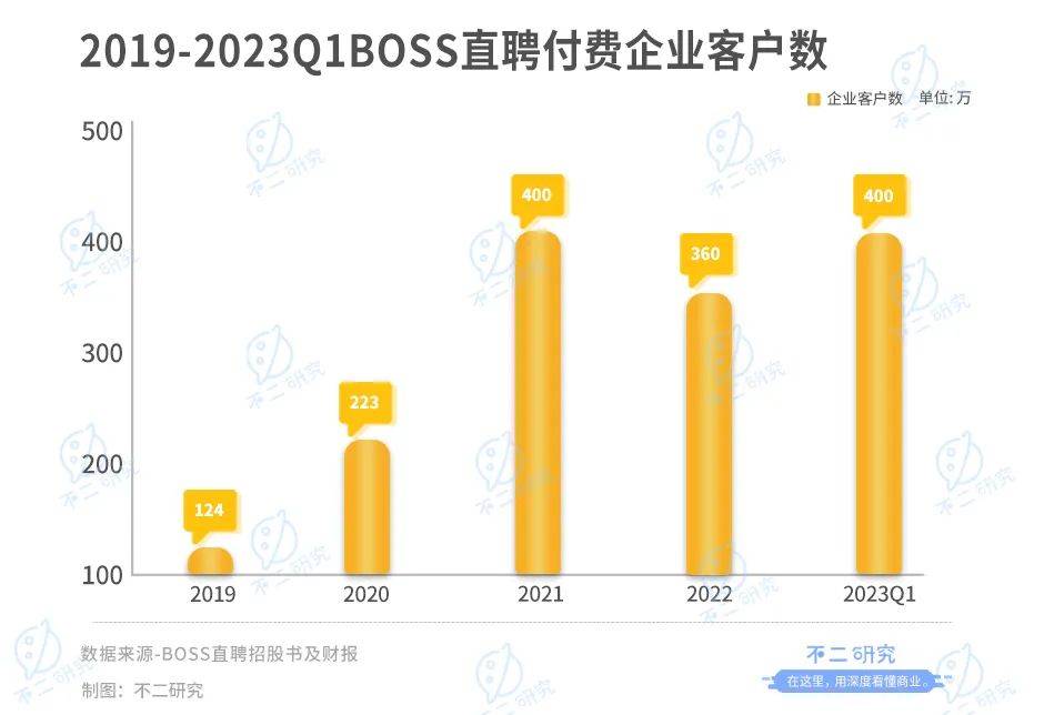 付费企业客户数量也正在高速增长中。2019-2022年及2023年一季度,BOSS直聘的付费企业客户数为124万、223万、400万、360万和400万;其中,去年三季度MAU环比净增590万。