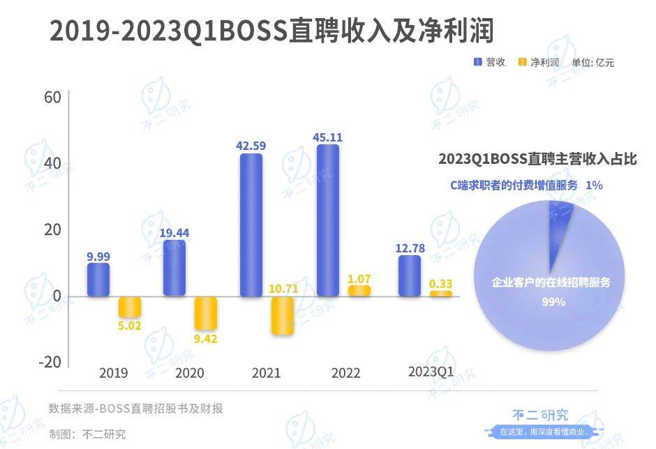 据一季报显示,2023年一季度,BOSS直聘来源于企业客户的在线招聘服务收入,在总营收占比高达99%;来自C端求职者的付费增值服务收入,总营收占比仅有约1%。