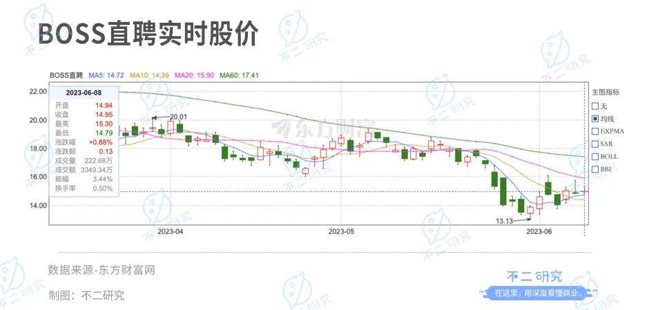 5月25日,财报公布后的首个交易日,其股价下跌8.48%;截至美东时间6月8日美股收盘,BOSS直聘股价报收14.95美元/股(折合人民币106.41亿元),对应市值66.54亿美元(折合人民币473.61亿元)。