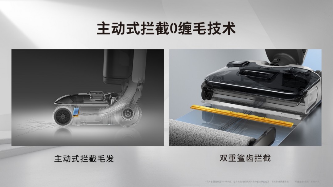 毛发缠绕是洗地机产品一直存在的问题,此前行业一直未有妥善的解决方案。基于用户痛点,石头科技进行了海量的技术测试,带来了从源头处解决毛发缠绕问题的主动式拦截0缠毛技术。通过将拦截装置前置,使得毛发在到达滚刷1/4处时就会被立刻阻断,不给毛发缠绕成圈的机会,从源头处阻止毛发缠绕。同时A30系列还采用了全新升级的双重鲨齿架构,密集鲨齿刮刀高效梳理拦截毛发,恒压平直刮刀拦截灰尘并强效刮除污水,不仅能拦截毛发更能强效控制水渍残留,双重拦截确保体验无忧。