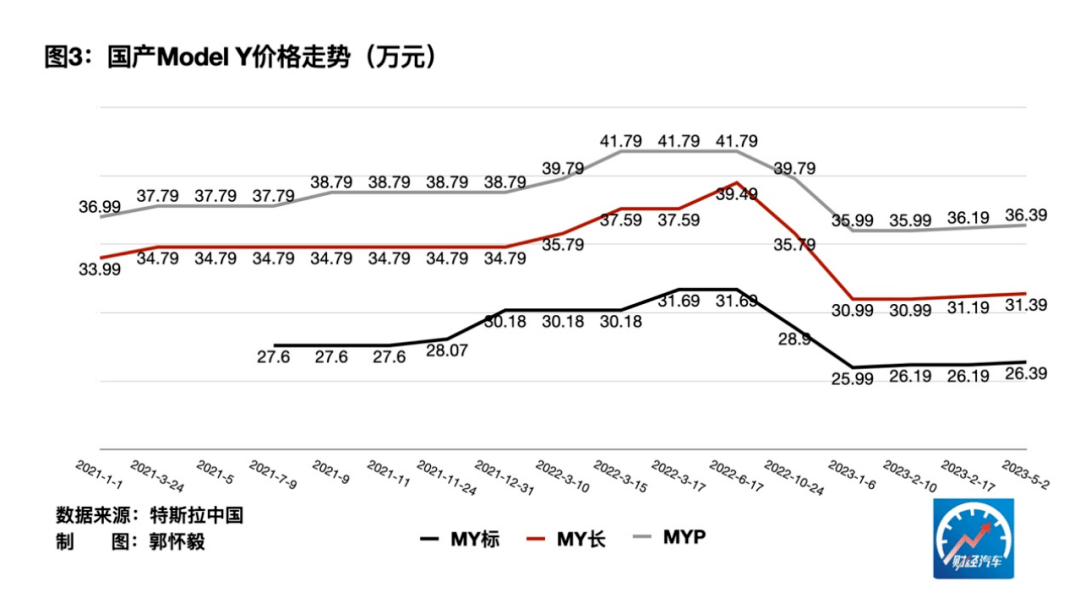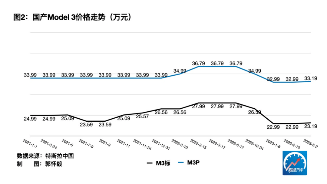 2022年10月以来,国产Model 3和Model Y售价多次下调。今年1月6日,Model 3和Model Y在中国的起售价分别降至22.99万元和25.99万元,创下了两款车型实现国产以来的历史最低价。如果对比27.99万元和31.69万元的历史最高售价,Model 3和Model Y的累计降幅分别高达5万元和5.7万元。