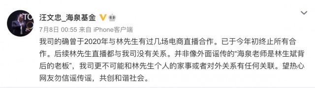 对此,海泉基金联合创始人汪文忠在微博回应称,“我司的确曾于2020年与林先生有过几场电商直播合作。已于今年初终止所有合作。后续林先生直播都与我司没有关系。并非像外面谣传的’海泉老师是林生斌背后的老板’,我司更不可能和林先生个人的家事或者对外关系有任何关联。”