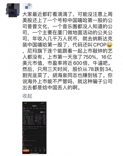 一是“中国嘻哈第一股”普普文化登陆纳斯达克,股价暴涨,期间一度大涨近8倍,胡海泉因为曾百万元参与投资而被热议。