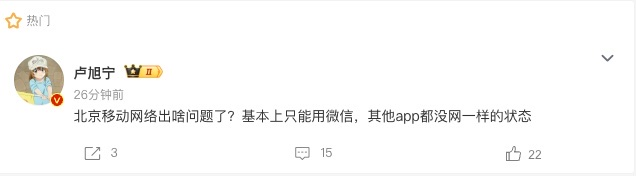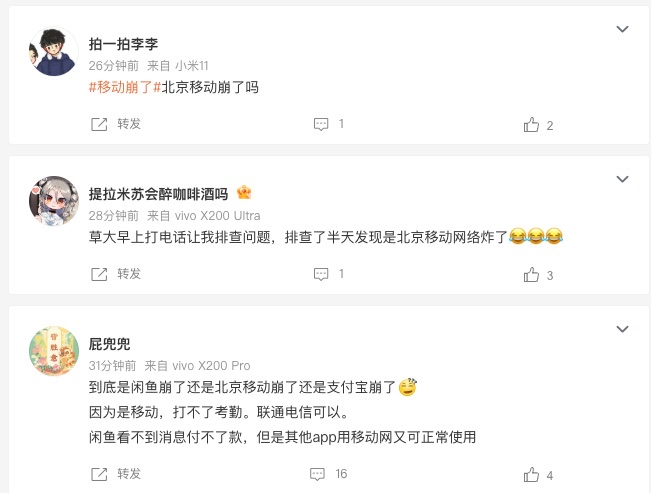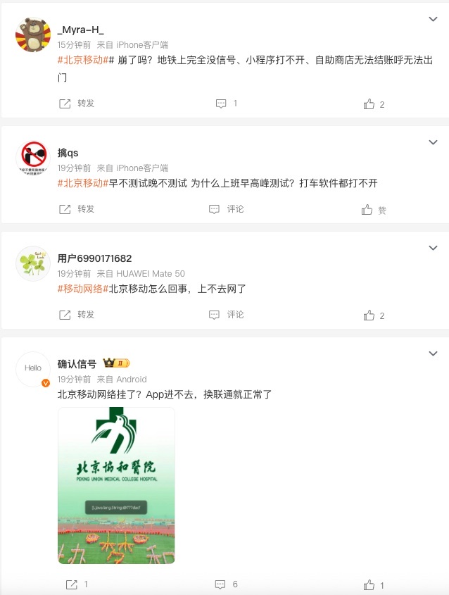北京移动网络今早疑似出现故障 网友反馈多个APP无法正常使用快讯