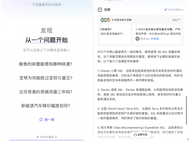 大会现场,“发现·AI搜索”展示了强大的知识储备量,不仅可以回答历史沉淀的知识,也可以回答最新发生的科技动态。例如,户外运动爱好者想了解“露营两天一夜用什么背包,有什么品牌推荐”,该功能可以溯源到真实答主的优质专业回答,用户不仅可以深入浏览答主的专业内容,也可以便捷地关注答主进一步咨询。