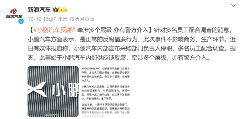 10月10日,市场面有消息称,小鹏汽车内部宣布采购部门负责人李丰停职,多名员工配合调查。此事涉及小鹏汽车内部供应链反腐,牵涉多个层级,亦有警方介入。