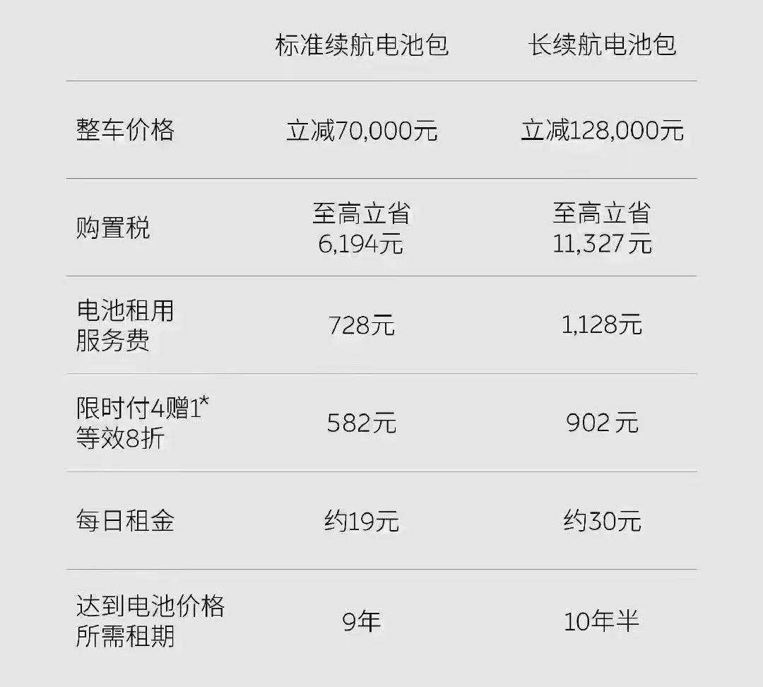 具体来看,Baas模式下,电池租用费从980/1680元每月降低到728/1128元每月,每月80元的电池保障费用也全面取消,再加上“租 4 赠 1”的优惠,过去低档的1060元每月的电池租赁费,降到了528元每月,相当于租电池直接打了个5折。