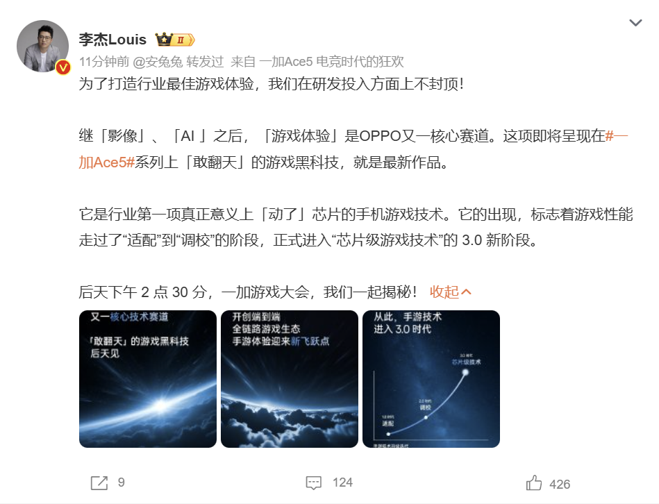 一加中国区总裁李杰表示:“我们将发布一项「敢翻天」的游戏黑科技,它深入芯片底层,突破行业常规思路,让手机游戏体验真正做到「断层领先」!”