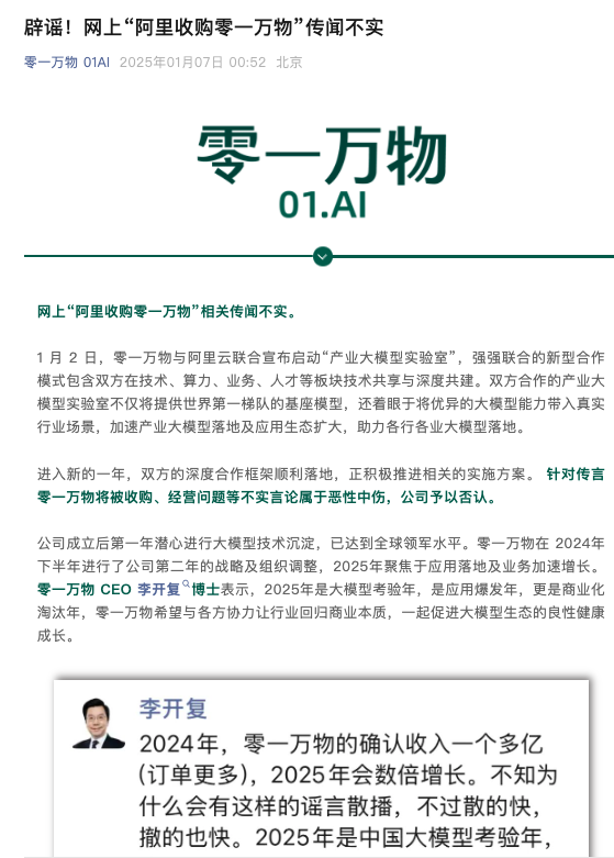 零一万物辟谣,否认出售大模型预训练团队给阿里云快讯