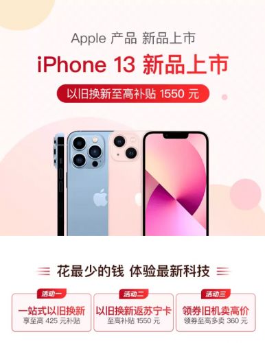 据了解,苏宁易购针对iPhone 13新品推出一系列专属福利,其中包括值享焕新服务,可享受2年AppleCare+ 官方保障,官网零售价5折换新机权益。