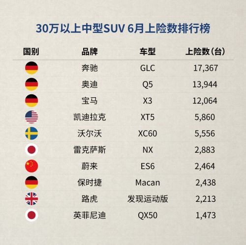 蔚来ES6六月上险数为2464台,稳居豪华中型SUV十强榜,排名第七。
