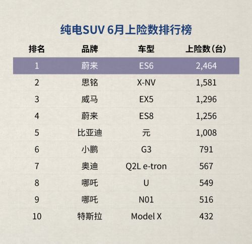 蔚来ES6六月上险数2464台 连续10个月蝉联中国电动SUV销冠快报