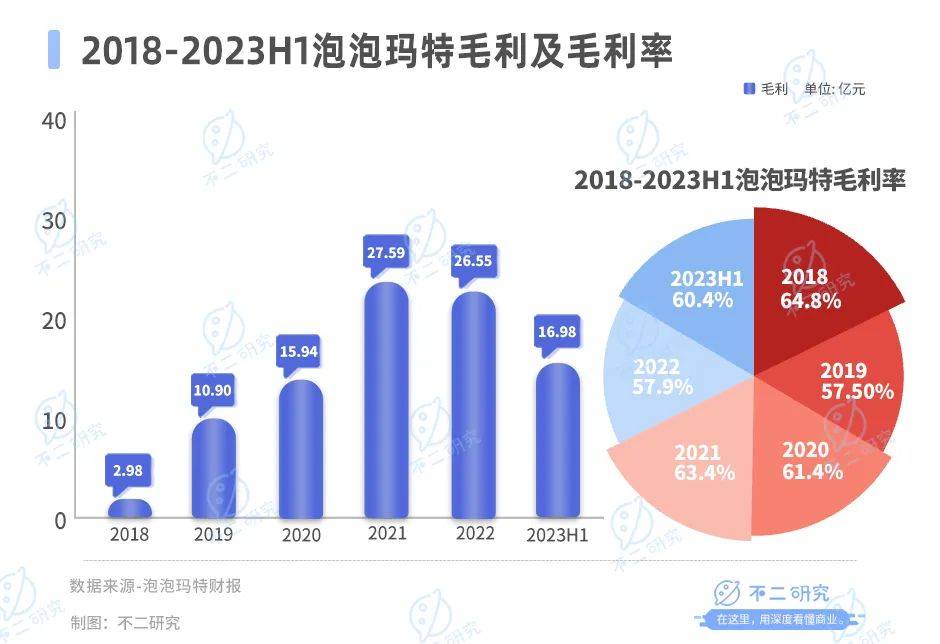 从毛利率来看,泡泡玛特2018-2022年毛利率逐年下滑,分别为57.9%、64.8%、63.4%、61.4%、57.5%,而今年上半年,泡泡玛特的毛利率为60.4%。
