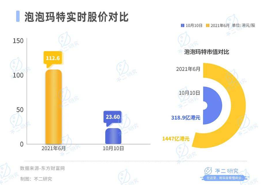 截至10月10日港股收盘,泡泡玛特报收23.60港元/股,对应市值318.9亿港元(约折合人民币297.35亿元);对比2021年6月的市值高点1447亿港元,市值已缩水77.96%。