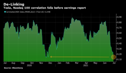 特斯拉股价与纳斯达克100指数之间的20天关联性从6月17日的0.83降至0.14,继CEO马斯克对比特币做出看好评论之后,自那之后。