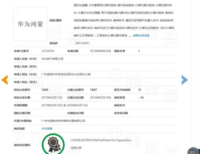 5月24日消息,国家知识产权局商标局网站显示,华为已申请“华为鸿蒙”商标,申请日期是2018年8月24日,注册公告日期是2019年5月14日,专用权限期是从2019年5月14日到2029年5月13日。