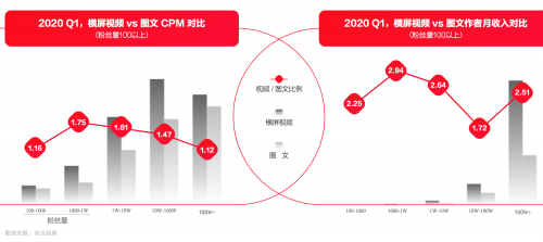 更多的扶持、更大的流量池、更高的用户留存率,也意味着更具吸引力的商业前景。相较而言,视频的变现方式比图文更丰富,西瓜视频数据显示,2020年第一季度,粉丝量在10万以下、或百万以上的横屏视频创作者,他们的月收入都在图文创作者的2倍到3倍之间。
