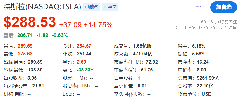 美股周三收盘,特斯拉股价大涨14.75%,上涨37.09美元至288.53美元,盘中最高达289.59美元,创年内新高。