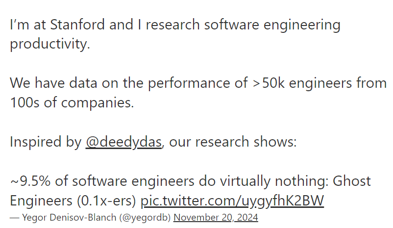 这项研究被命名为 “幽灵工程师”研究:那些“摸鱼”的程序员拿着全薪,每年给公司造成数十亿美元的损失。与“10倍工程师”相比,他们被称为“0.1工程师”,因为他们的产出相当于中位工程师0.1的工作量。“10倍工程师”是指工作产出特别大的程序员。