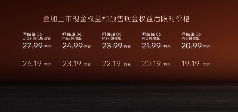 【TechWeb】4月19日,定位“智美豪华运动轿车”的阿维塔06在重庆正式上市。新车推出了纯电和增程双动力,共5个车型版本,官方指导价为20.99万-27.99万元,权益后仅19.19万元起。即刻起,用户可通过阿维塔App及小程序进行选购,预售锁单的首批用户最快将于4月20日开启交付,真正实现“上市即交付”。
