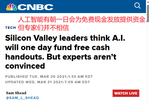 CNBC:Silicon Valley leaders think A.I. will one day fund free cash handouts. But experts aren’t convinced