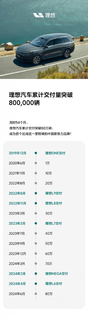 国内新势力品牌首家:理想汽车累计交付突破80万辆,历时54个月快讯