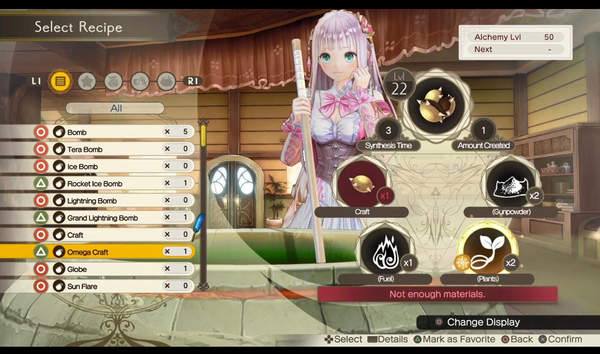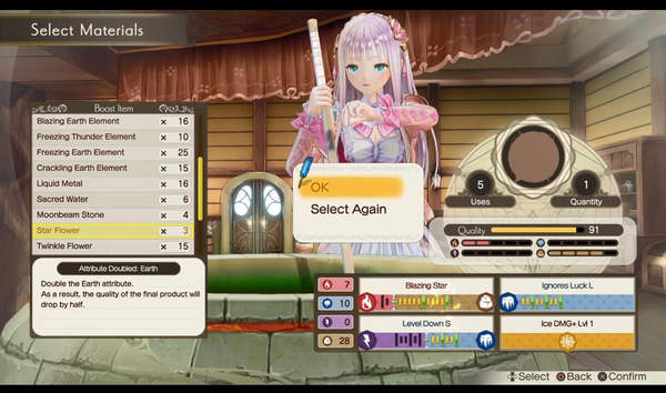 调和的配方可以透过解读“炼金谜语之书”,或是在故事中获得参考书。本作的调和以“亚兰德”系列为基础,除了大家所熟悉的“质量”、“特性”等要素,还导入了“不可思议”系列中登场的“炼金成分”、“加成道具”等新要素。