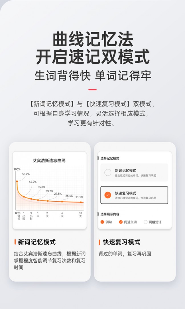 更为关键的是,作业帮喵喵机电子单词卡结合了艾宾浩斯遗忘曲线的原理,通过科学的记忆方法帮助学生高效记忆单词。这一原理指出人的遗忘速度随时间推移逐渐减慢,因此通过智能调节复习次数和时间间隔,喵喵机电子单词卡能够在学生即将遗忘时及时提醒复习,巩固记忆效果。
