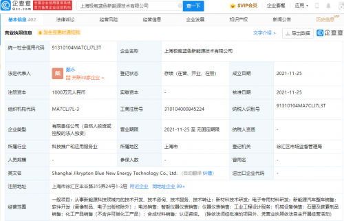 【TechWeb】企查查APP显示,11月25日,上海极氪蓝色新能源技术有限公司成立,法定代表人为戴永,注册资本1000万元人民币,经营范围包含:新材料技术研发;电子专用材料研发;新能源汽车整车销售;合成材料销售等。