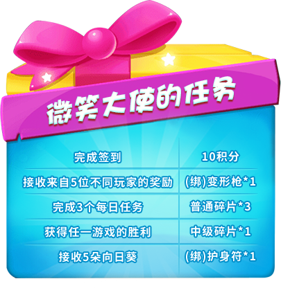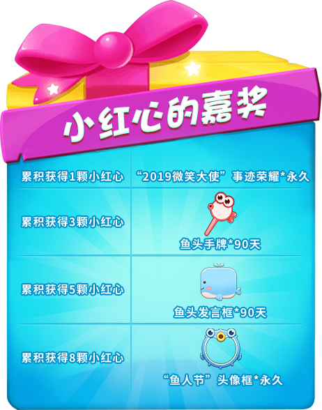活动内容:快来成为愚人节特别的 “微笑大使”吧!活动期间,每天完成微笑大使的所有任务,即可获得一颗“小红心”,累积的“小红心”越多,奖励就越多!!