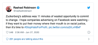Color Of Change总裁拉沙德·罗宾逊(Rashad Robinson)毫不留情地指出,扎克伯格的声明无异于“11分钟的空口承诺”,还再次呼吁广告主不要在Facebook平台上投放广告。
